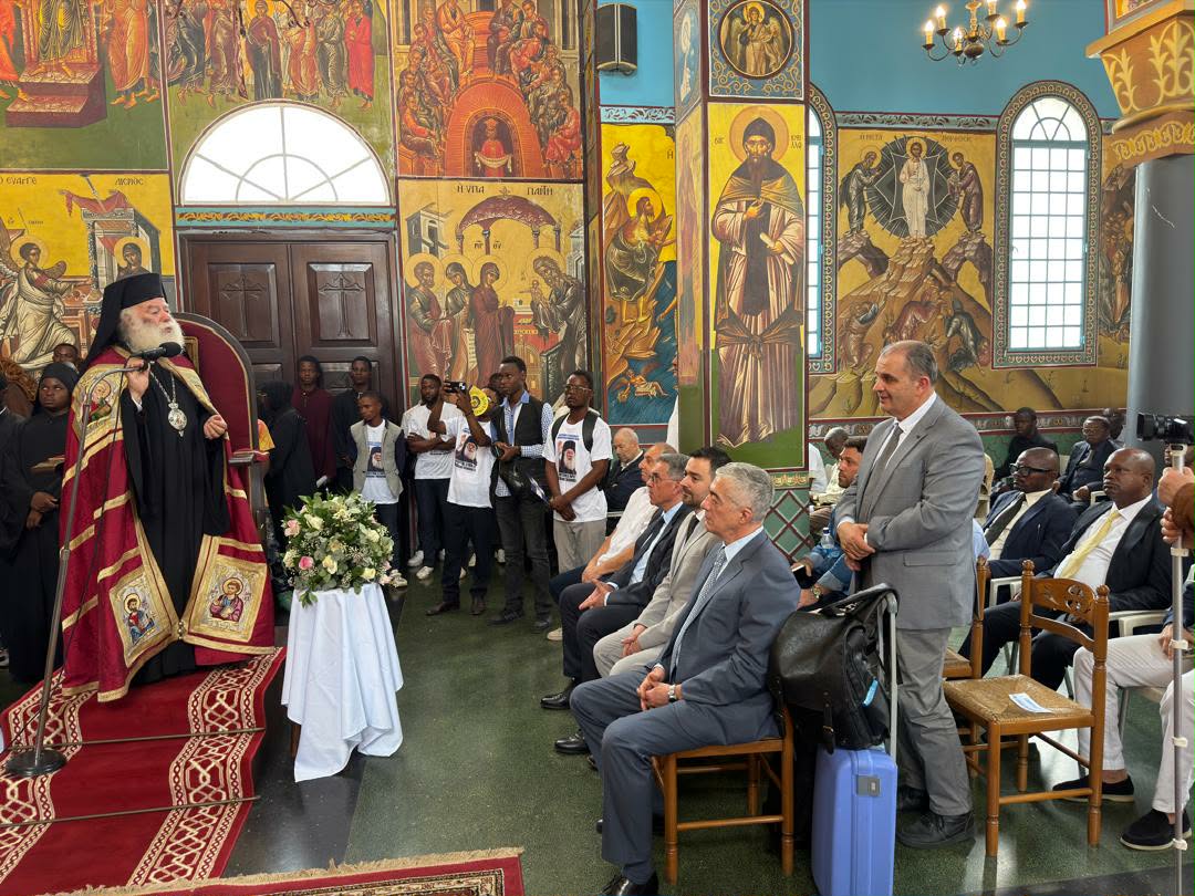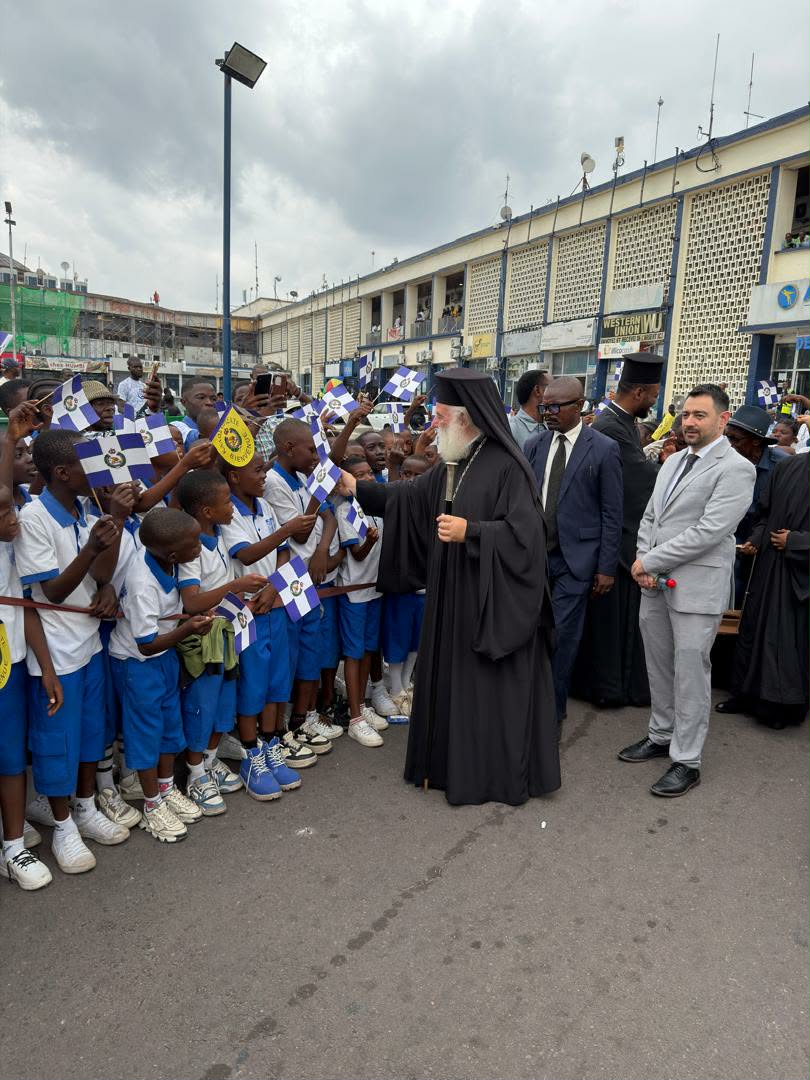 Ο Μακαριώτατος με μεγάλη συγκίνηση ευλόγησε και αγκάλιασε τα παιδιά, τα οποία ασταμάτητα τραγουδούσαν και καλωσόριζαν τον πνευματικό τους πατέρα. Στην συνέχεια ο Μακαριώτατος αφίχθη στον Μητροπολιτικό Ναό του Αγίου Νικολάου της Ελληνικής Κοινότητας Κινσάσας. Εκεί τον υποδέχθηκαν ο Μητροπολίτης Κανάγκας κ. Χαρίτων και οι Επίσκοποι Κωνσταντιανής κ. Κοσμάς και Ιππώνος κ. Στέφανος. Επίσης οι Έλληνες της Ελληνικής Κοινότητας Κινσάσας αλλά και πολλοί πιστοί της Ιεράς Μητροπόλεως.
